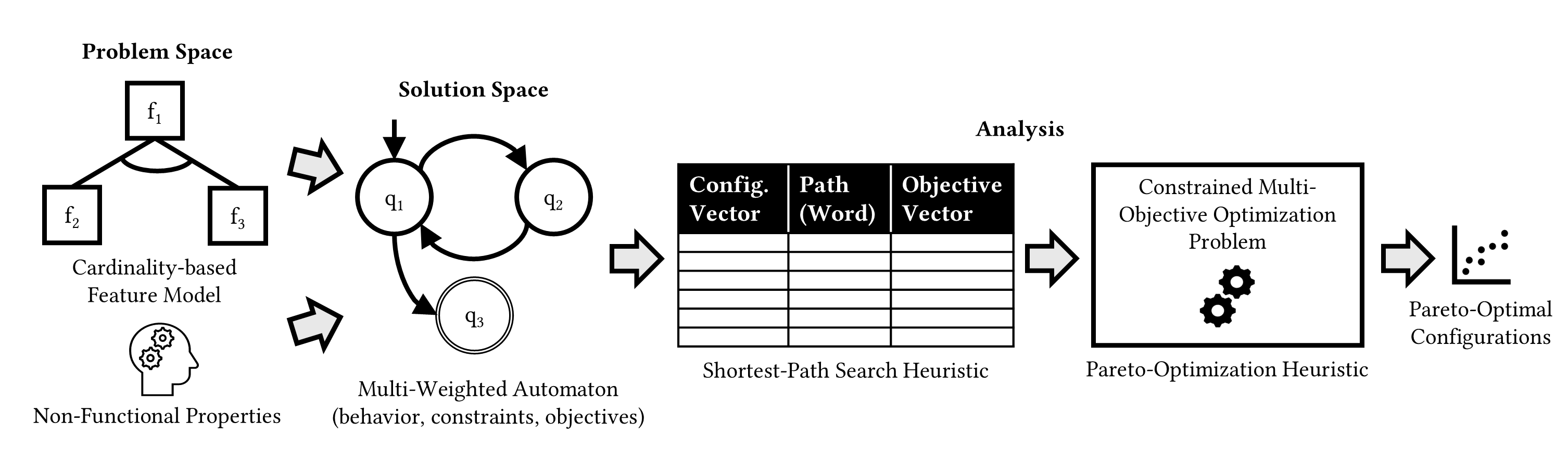 The figure below shows an overview of our analysis pipeline. In the problem space, we use a cardinality-based feature model to specify the valid configuration space using multi-instance features and we require knowledge of the non-functional properties as input. In the solution space, we encode the behavior of the system using a multi-weighted automaton. The different weights in the automaton allow us to model constraints of individual system actions as well as the impact of actions on non-functional properties. This allows us to find optimal configurations by using analysis techniques for weighted automata. To this end, we perform several shortest-path searches on the weighted automaton with different relative weightings of the objective values. Finally, we perform Pareto analysis on the combined shortest-path results to obtain a set of Pareto-optimal configurations for the system.