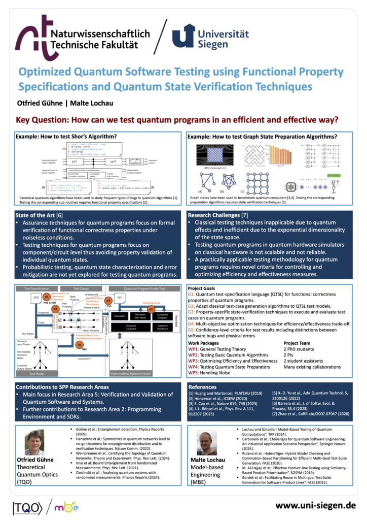 Ziel dieses Projekts ist eine neue Methodik für funktionales White-Box-Testing von Quantenprogrammen, die diese Herausforderungen bewältigt. Als ersten Schritt definieren wir eine quantenspezifische Testspezifikationssprache, um die zu testenden Eigenschaften der funktionalen Korrektheit zu formalisieren. Die Sprache soll es Entwicklern ermöglichen, Eigenschaften so auszudrücken, dass effektive Tests erzielt werden und gleichzeitig die praktische Testbarkeit dieser spezifizierten Eigenschaften in einer Quantenumgebung gewährleistet ist. Wir kombinieren Techniken zur Generierung von Testfällen aus probabilistischen Testmodellen mit Verfahren zur Verifizierung von Quantenzuständen, um die Ausführung und Auswertung der generierten Testfälle in einer simulierten Quantencomputerumgebung zu operationalisieren. Wir verwenden geschätzte Kostenmaße für verschiedene Strategien zur Zustandsverifizierung, um den Kompromiss zwischen Effizienz (Testaufwand) und Effektivität (Wahrscheinlichkeit der Erkennung von Eigenschaftsverletzungen) zu optimieren und so das Konfidenzniveau der Testergebnisse zu charakterisieren.